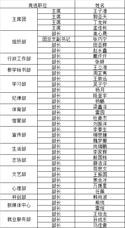 为了进一步加强校学生会学生干部的自我服务、自我管理能力,帮助学生干部树立服务学院师生的意识,培养学生干部的积极性和主动性。根据《betway必威中文正版学生干部管理规定》、《betway必威中文正版学生会章程》的组织原则和分院学生会的工作实际,通过民主推荐、竞岗演说的方式,结合学生会后备期间所负责相关事务完成度及个人能力等情况综合考量,现研究决定拟聘王子濠等39名同学为智能制造学院2020届学生会干部。现对拟任命的学生会干部予以任前公示: