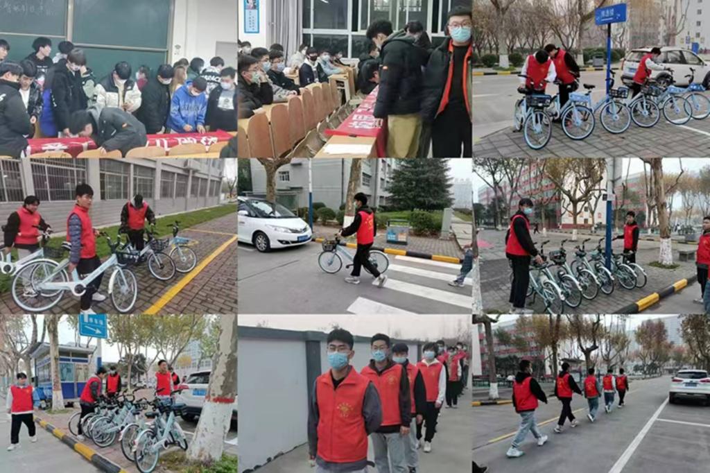 首先,我院组织了学生志愿者整理校内乱停乱放的共享单车活动。志愿者们将乱停放的共享单车逐一摆放至校内固定停车点,并积极引导广大师生自觉维护校园交通秩序与环境秩序。