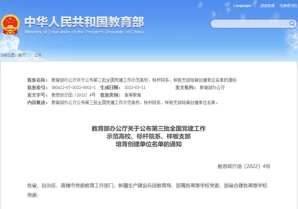 近日,教育部思想政治工作司公布了第三批新时代高校党建示范创建和质量创优工作遴选结果,我校电子信息学院数字通信教师党支部获批第三批“全国党建工作样板支部”培育创建单位,这是我校入选的第三个“全国党建工作样板支部”。